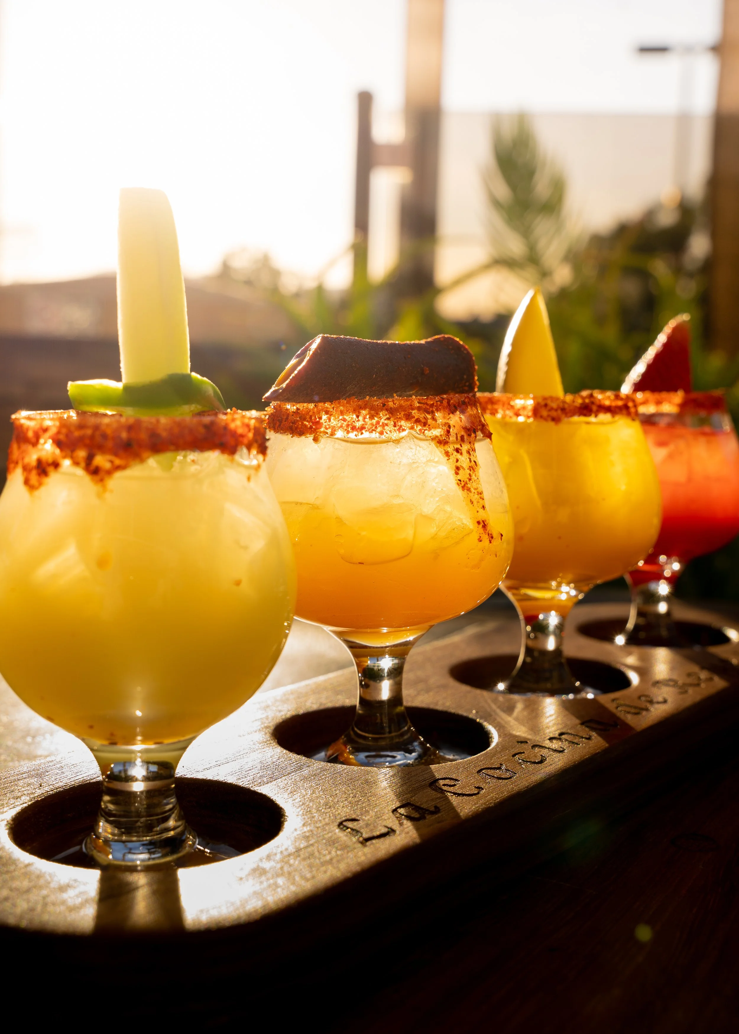 A tasting flight of four Margaritas; Strawberry, Tamarindo, Cucumber Jalapeño & Mango.
