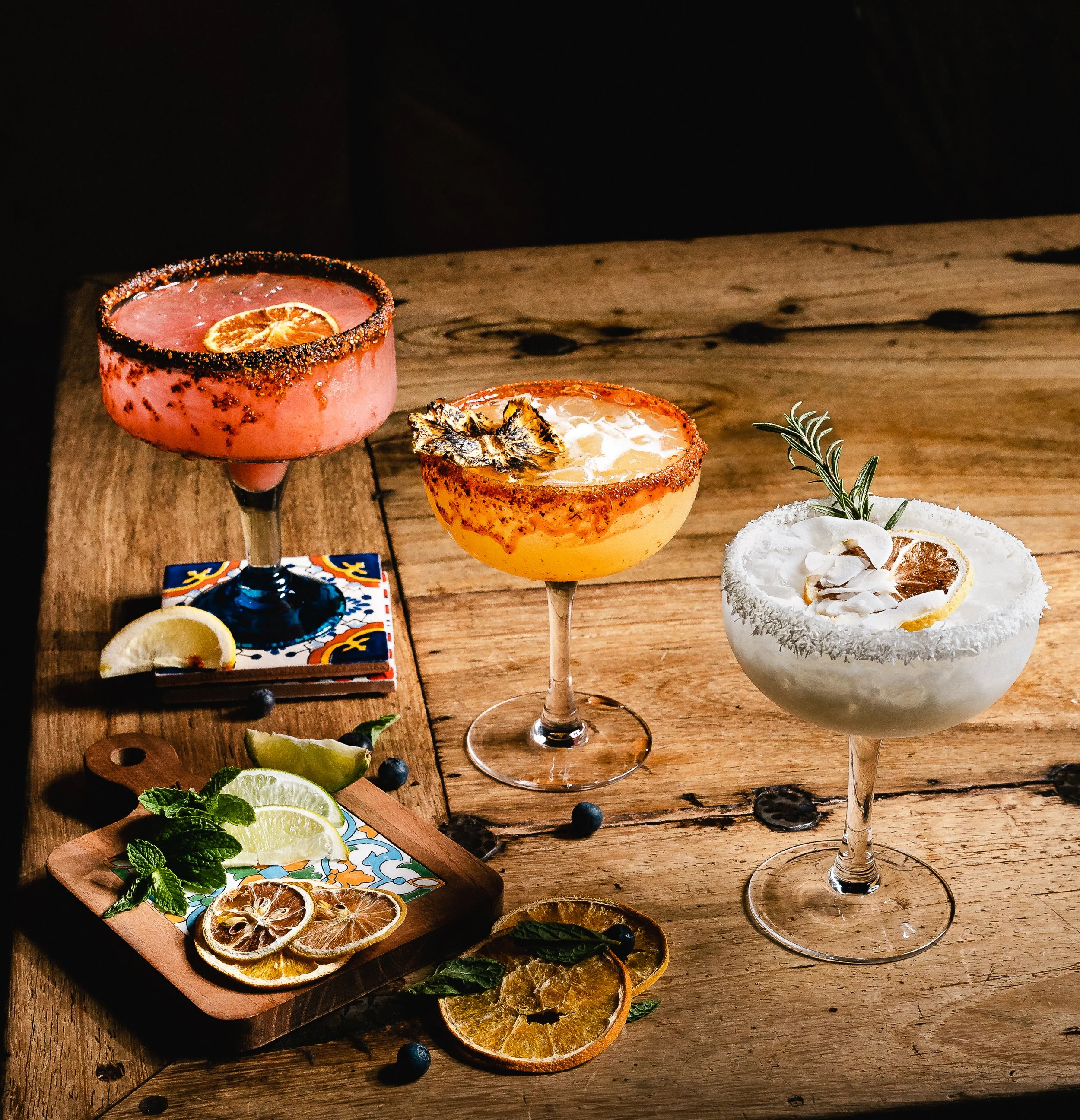 (Left to Right) Guava Margarita, Smoked Pineapple Margarita, Coconut Margarita