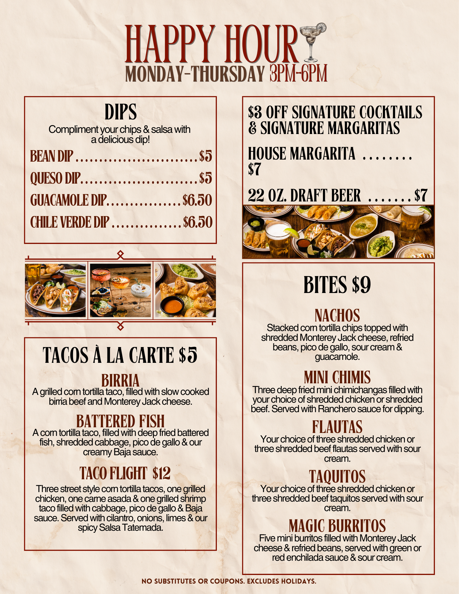 MONDAY - THURSDAY 3PM - 6PM! EXCLUDES HOLIDAYS