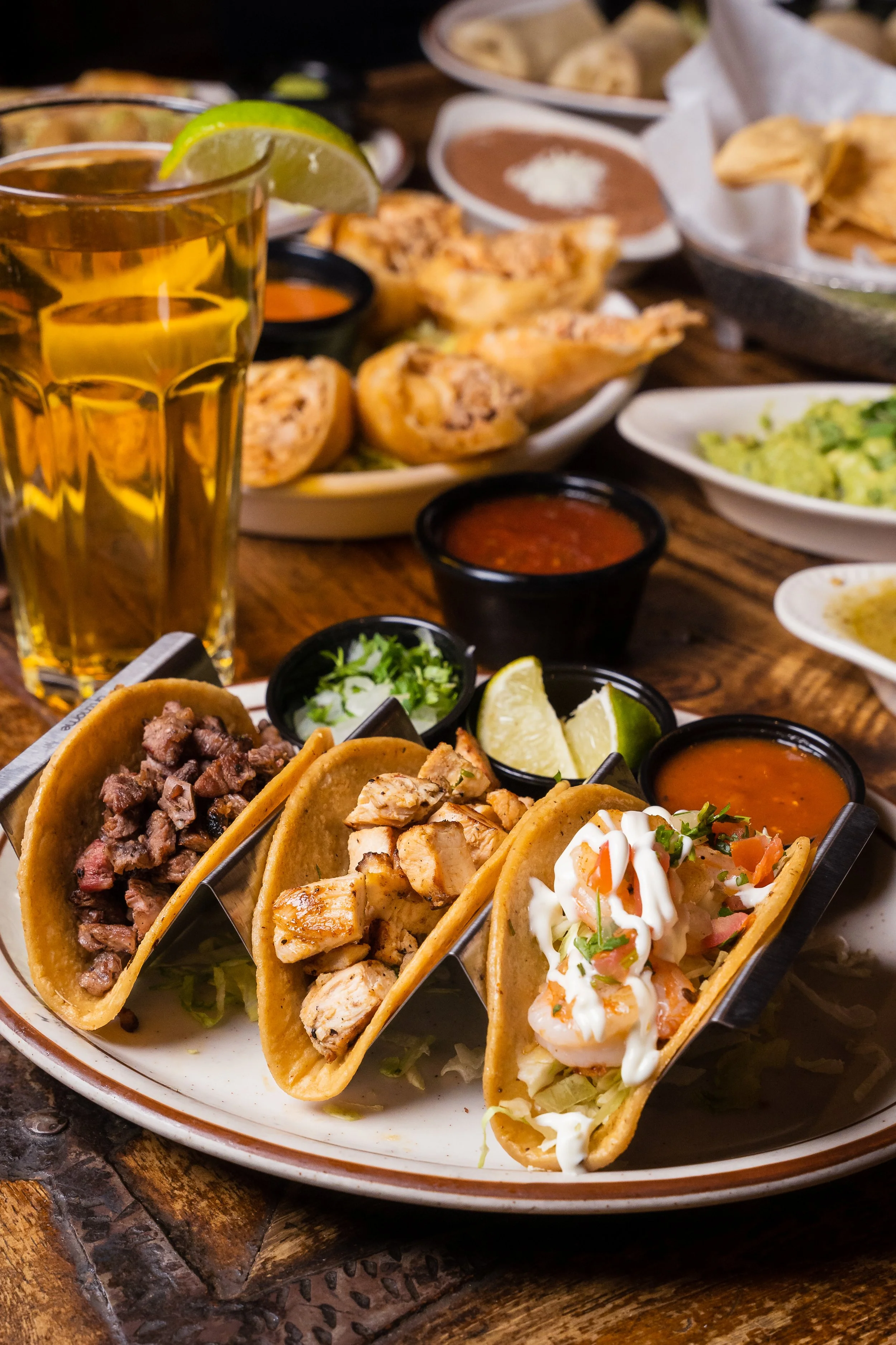 Three street style corn tortilla tacos, one grilled chicken, one carne asada & one grilled shrimp taco filled with cabbage, pico de gallo & Baja sauce. Served with cilantro, onions, limes & our spicy Salsa Tatemada.