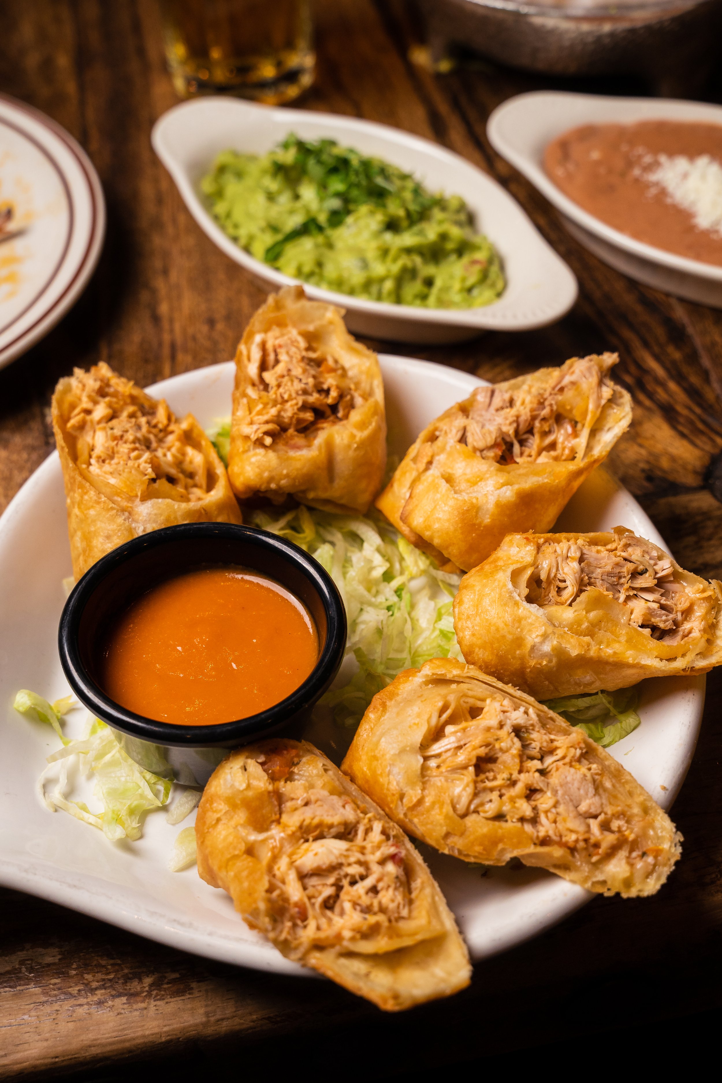 Three deep fried mini chimichangas filled with your choice of shredded chicken or shredded beef. Served with Ranchero sauce for dipping.